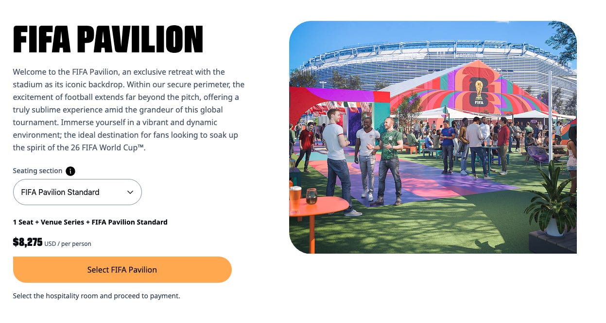 The lowest cost hospitality option is the ‘FIFA Pavilion’, which would cost me $8,275 per person for 6 games for a grand total of $33,100! I don’t know about you, but that price seems steep for 5 group stage games and 1 Round of 32 game, given the fact we don’ even know the draw yet and which teams will be playing in those group stage games.